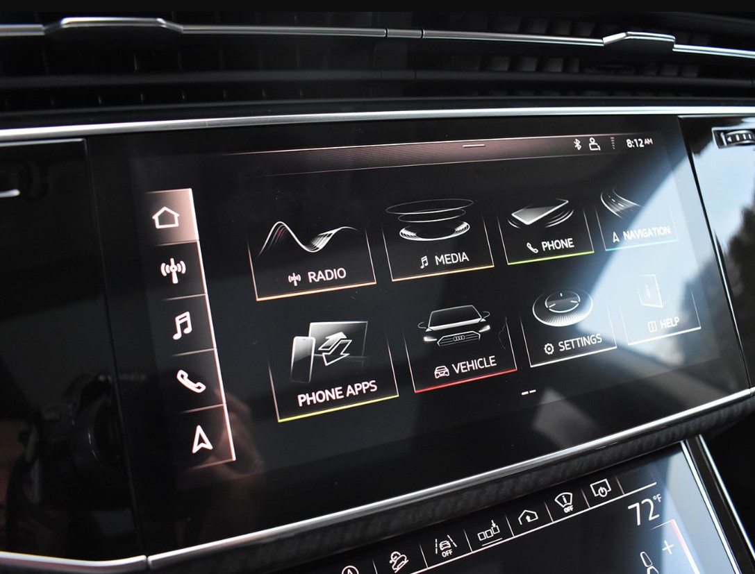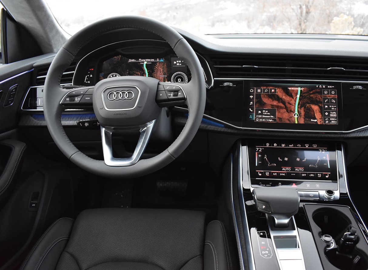 فور جلوسك داخل مقصورة اودي Q8 الفاخرة، سيكون أول ما يجذب انتباهك هو كيفية تصميم الداخلية بحيث تتمحور حول نظام MMI الخاص بالشركة للترفيه المعلوماتي، حيث يتضمن ذلك شاشة لمسية علوية قياس 10.1 إنش يمكنك أن ترى أسفلها شاشة لمسية أخرى قياس 8.6 إنش، حيث تسمح لك الشاشة العلوية بعرض عدة أشياء تتضمن خرائط الملاحة ومشاهد جوجل للطرقات بالأقمار الصناعية، الى جانب الموسيقى التي تقوم بتشغيلها حالياً.