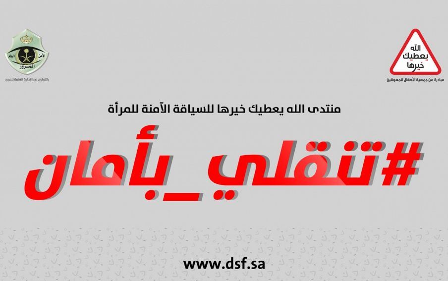 تنظم المبادرة الوطنية "الله يعطيك خيرها" للقيادة الآمنة والتي دشنها خادم الحرمين الشريفين الملك سلمان بن عبدالعزيز على المستوى الوطني وتتبناها جمعية الأطفال المعوقين بالتعاون مع الإدارة العامة للمرور، المنتدى الوطني الأول للقيادة الوقائية للمرأة تحت عنوان "#تنقلي_بأمان"، والذي انطلق هذا الشهر في أرض المعارض والمؤتمرات بمدينة الرياض.