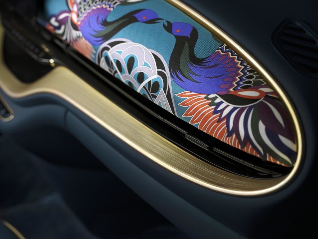 اول ما يجب ذكره عن هذه السيارة هو لونها. فمجرد النظر اليها ستظنين انك تشاهدين قطعة فاخرة من مجوهرات بولغاري، فهذا اللون الامبريالي هو احد اشهر اوجه ماركة بولغاري، ونجده في العديد من اكسسوارتها الفاخرة التي اشتهرت بها. وقد دمج طلاء السيارة بغبار فريد من الذهب الحقيقي، ما يجعلها تلمع في اشعة الشمس تماما كالمجوهرات.