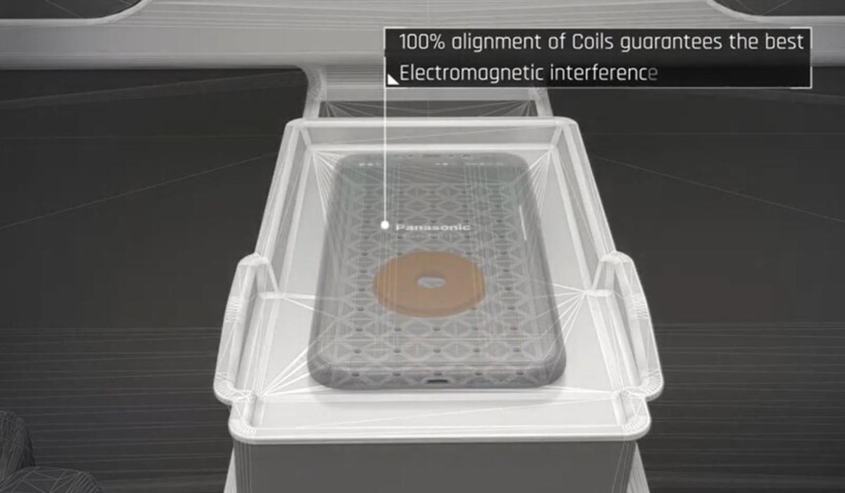 شاحن السيارة اللاسلكي Qi: تسعى باناسونيك إلى حل هذه مشكلة الشحن بشريحة متحركة تتجول تحت سطح الوسادة لتحديد المكان المناسب للهاتف والبدء في الشحن في أسرع موقع وأكثر فاعلية مما ينتج عنه أقل قدر ممكن من الحرارة المهدرة.