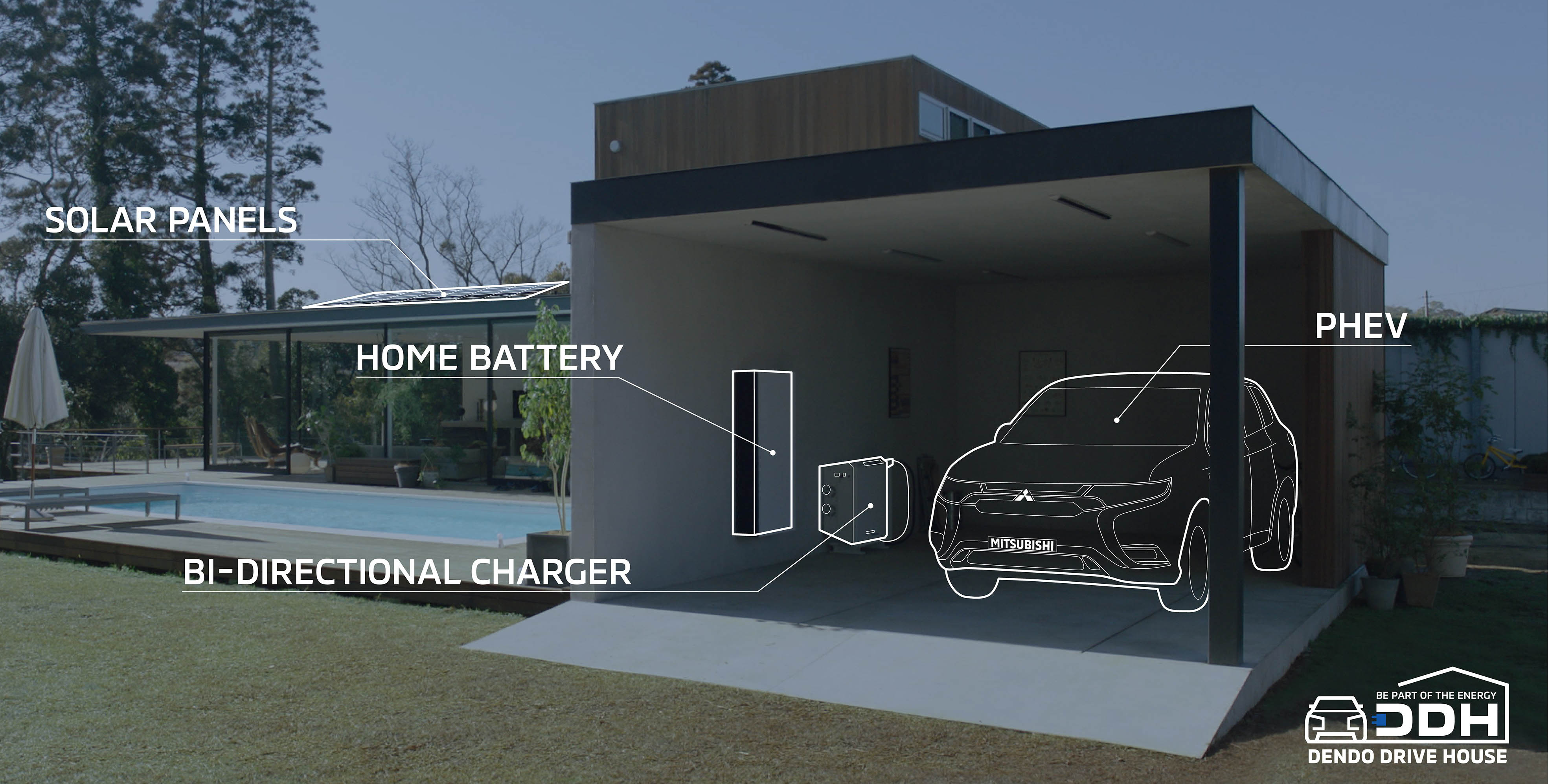 تقوم الفكرة على تخزين طاقة الألواح الشمسية في بطارية السيارة أو البطارية المركزية المتصلة بالمنزل ذاته بشكل يدوي أو أوتوماتيكي، حيث يساعد ذلك على تقليل الفواتير الشهرية بجانب العمل كمولد احتياطي عند انقطاع التيار، ويدعم النظام كل من السيارات الكهربائية بالكامل والهجينة ذات القابس مثل طراز ميتسوبيشي اوتلاندر PHEV الحالية، مع إمكانية مراقبة استهلاك الطاقة في أي وقت خلال اليوم عبر تطبيق ذكي للمنزل، حيث سيتاح النظام للبيع عبر وكالات الشركة في أوروبا واليابان هذا العام.