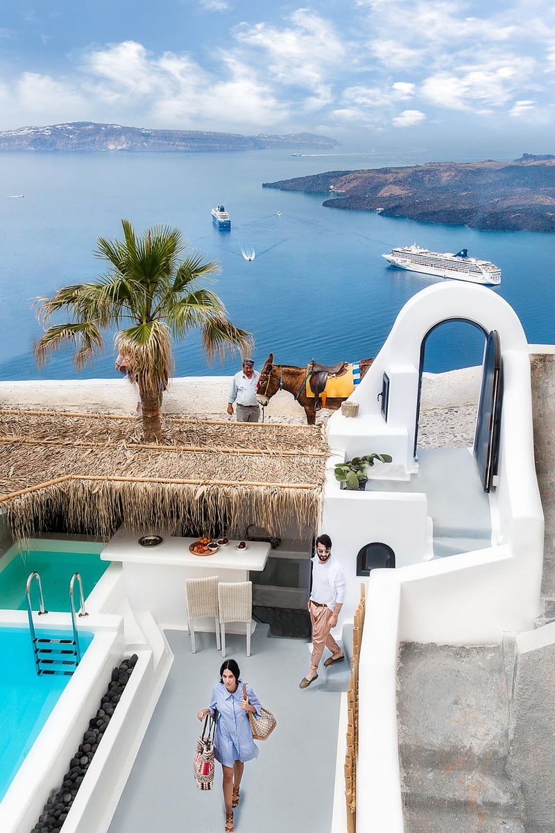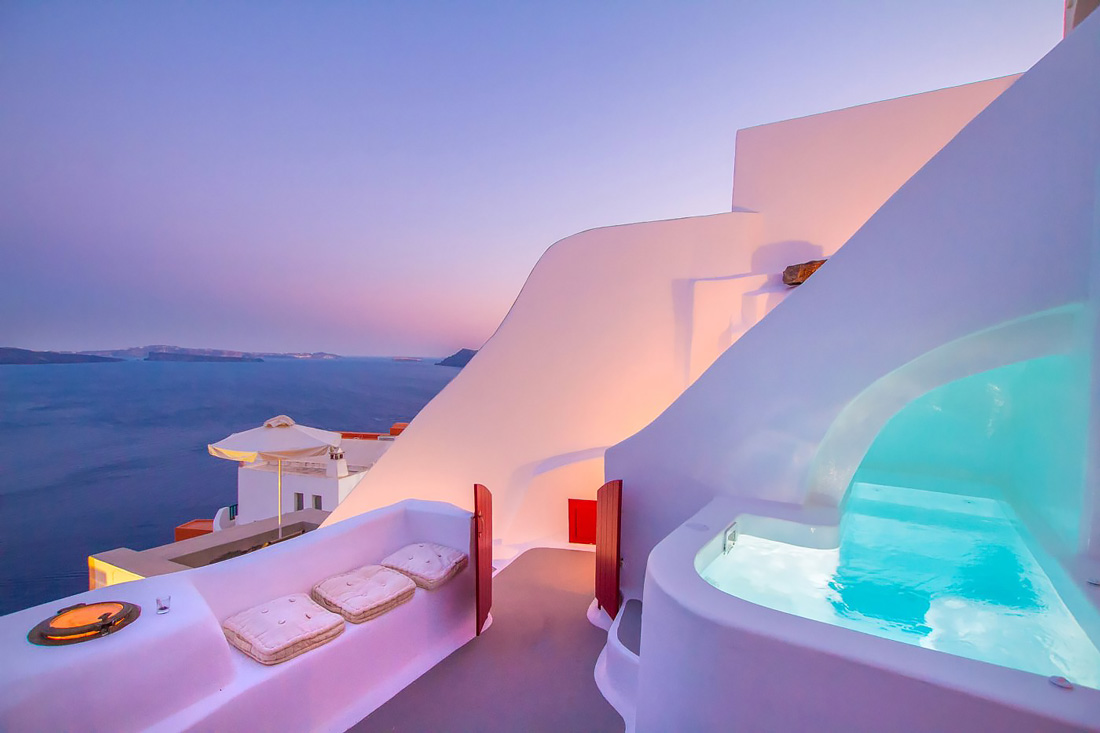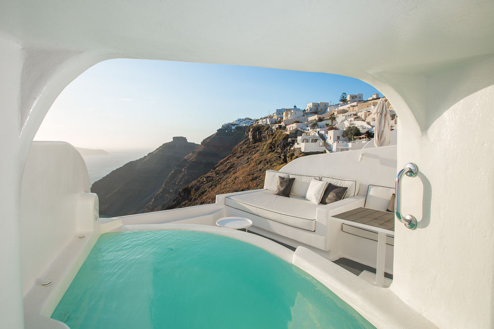 إطلالات ساحرة توفرها هذه الفيلات للمقيمين مع فتحات على شكل كهوف تحوي حمامات سباحة وغرف نوم مذهلة، تطغى الألوان البيضاء والزرقاء على المكان بالطبع وتدمج ذلك مع الديكور الداخلي البسيط والحديث للغاية ايضا، وإذا استثمرت أكثر في إجازتك ستتمكن من الحصول على شرفات تطل على الفوهة البركانية الغارقة وجاكوزي وحمامات سباحة عديمة الأطراف.