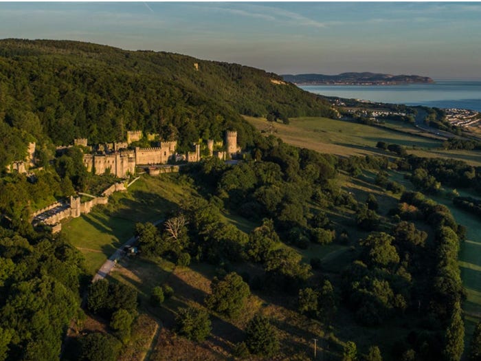 تطل القلعة على بلدة "ابيرجيل" في شمال ويلز، وعندما تلقي نظرة خارجية عليها ستدرك أنها من قصص الخيال: الهندسة المعمارية لتلك القلعة لن تجدها في كل العالم.