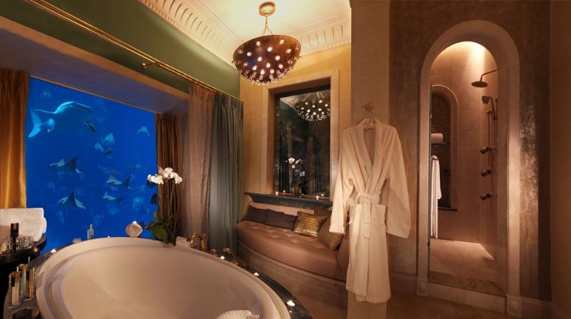 هل تخيلت يوماً أن تنام في غرفة في فندق وتستيقظ وأنت تشاهد الأسماك من حولك!! هذه ليست دعابة بل حقيقة، حيث يمكنك استئجار جناح تحت الماء في Atlantis ومشاهدة أكثر من 65 ألف نوع  من الحيوانات البحرية المدهشة في Ambassador Lagoon.