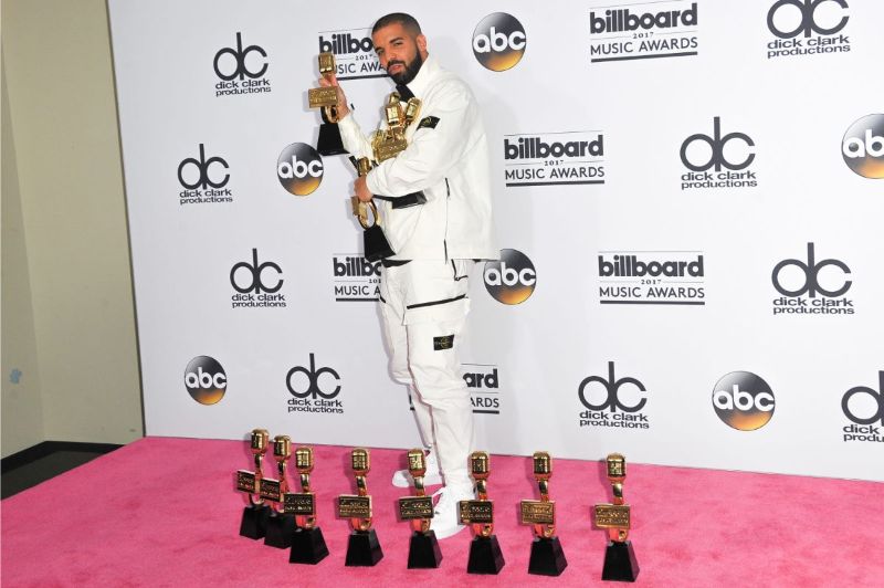 أُلتقطت هذه الصورة عام 2017 خلال حفل توزيع جوائز بيلبورد Billboard للموسيقى، اختار دريك لحضورها بدلة غريبة الشكل باللون الأبيض مع حذاء يبدو أنه رياضي وباللون الأبيض أيضاً.