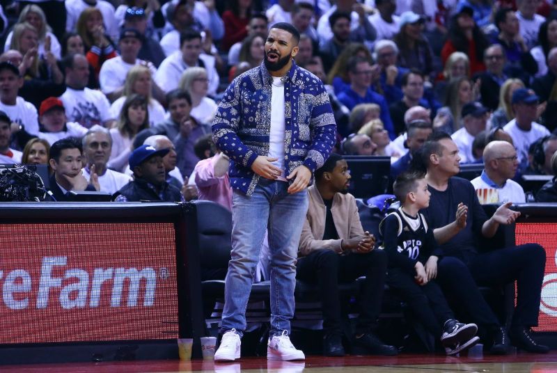 ألتقطت هذه الصورة هذا العام خلال نهائيات المؤتمر الشرقي لكرة السلة، اعتمد هنا طقم رياضي بشكل كامل فاختار سويت شيرت باللون الأسود كُتب عليه "Kawhi Me a River" بحروف بيضاء جريئة تكريماً للنجم Kawhi Leonard، ولكي يكتمل المظهر الرياضي ارتدى دريك حذاء رياضي من Nike Air Force 1.