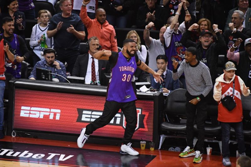 أُلتقطت هذه الصورة هذا العام خلال نهائيات الدوري الأميركي للمحترفين، ومن الواضح لنا أن دريك يحب فريق تورونتو رابتورز Toronto Raptors للسلة كثيراً، لذلك ارتدى قميص رقم "30" في تلك الليلة على ملابسه السوداء وحذائه الرياضي الأبيض.