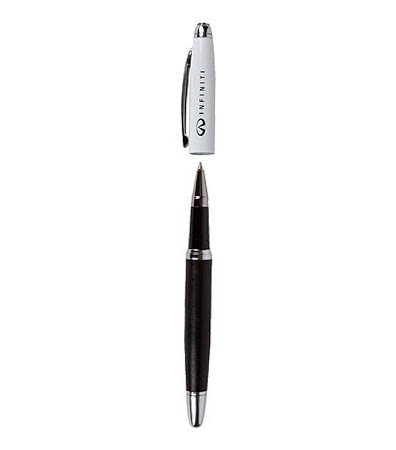 تصميم ناعم وذكي لقلم لامع يضمن لك انطباع إيجابي في مناسبات العمل الهامة. تم تغليف ماسورة القلم بالجلد الصناعي وصنع غطاءه من المينا البيضاء التي طبعت عليها علامة انفينيتي.