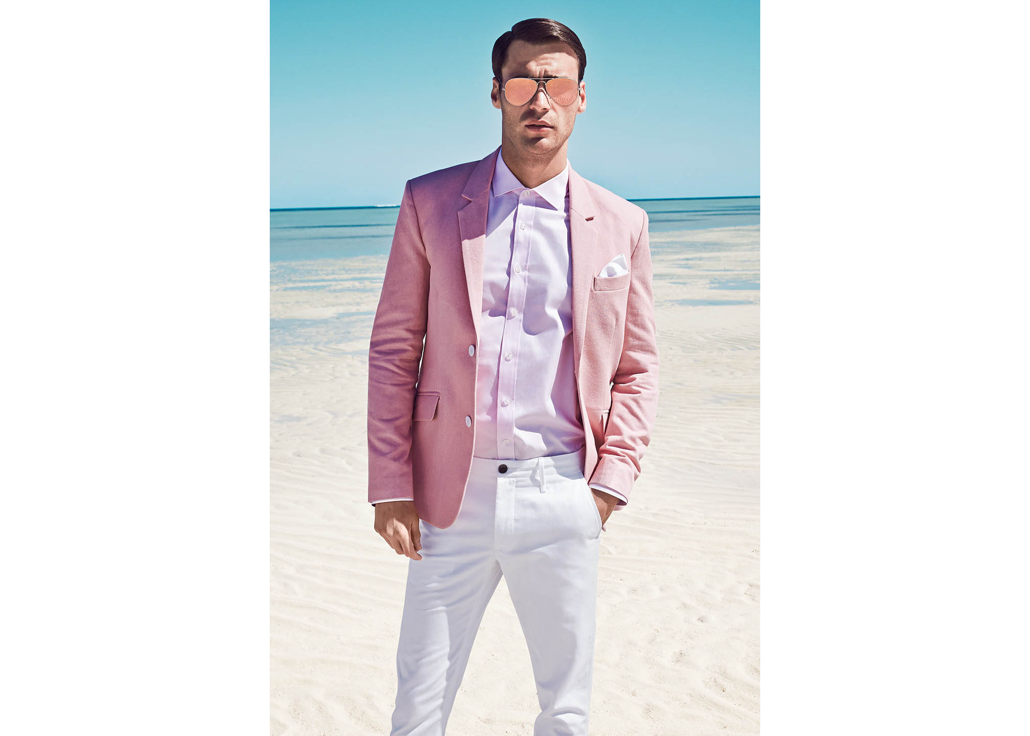 تجرأ واختر بذلة باللون الذهري الفاتح، لتتميز باطلالة فريدة لا يتقنها سوى خبير الموضة وعاشقها، فهذه الاطلالة عصرية ومميزة، ويمكن ان ترتدي معها قميصا ابياضا مثلا.