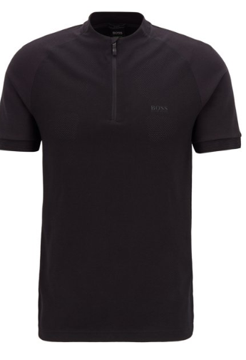 اما ان كنت تفضل اللون الاسود، فاجعل من Slim-fit zip-neck polo shirt with S.Café خيارا لك، فهو قميص بولو عالي الأداء من BOSS Menswear، تعلوه فتحة مطاطية تضيف اليه مظهرا رياضيا وهو مصمم من نسيج يمكن اعادة تدويره لحماية مطلقة للبيئة.