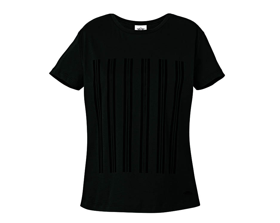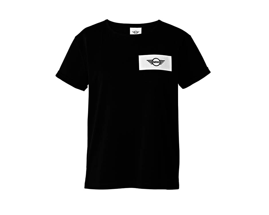 قميص تي شيرت اسود مع جيب على جهة القلب وشعار ميني كوبر باللونين الأسود والأبيض