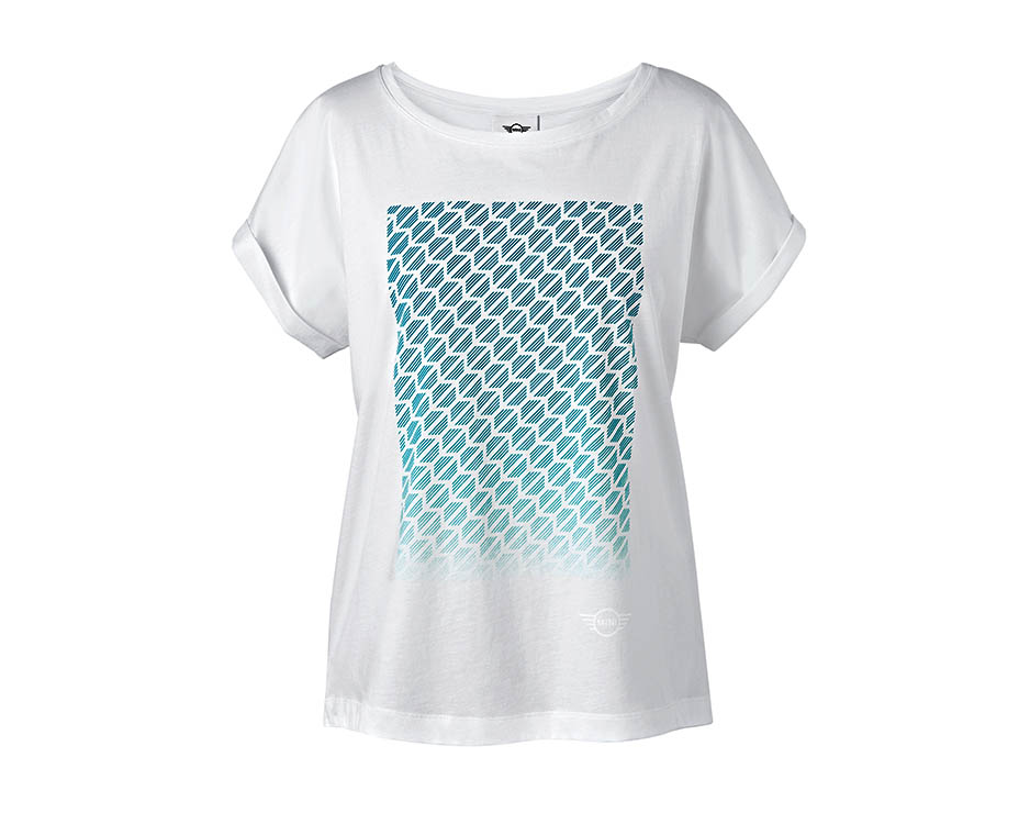 قميص تي شيرت باللون الأبيض مزيّنة بطبعة Signet بتدرّجات اللون الأزرق وشعار ميني كوبر باللون الأبيض