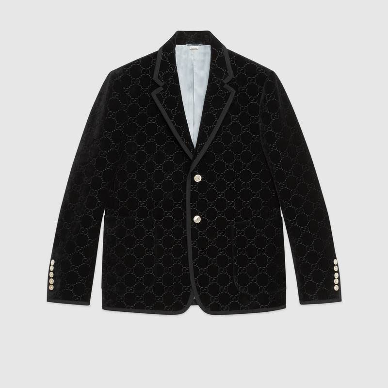 هذه السترة المسائية مقطّعة في قماش GG مخملي يعكس تراث غوتشي مع تعزيز فكرة أن الرمزية تتعدى الفصول.