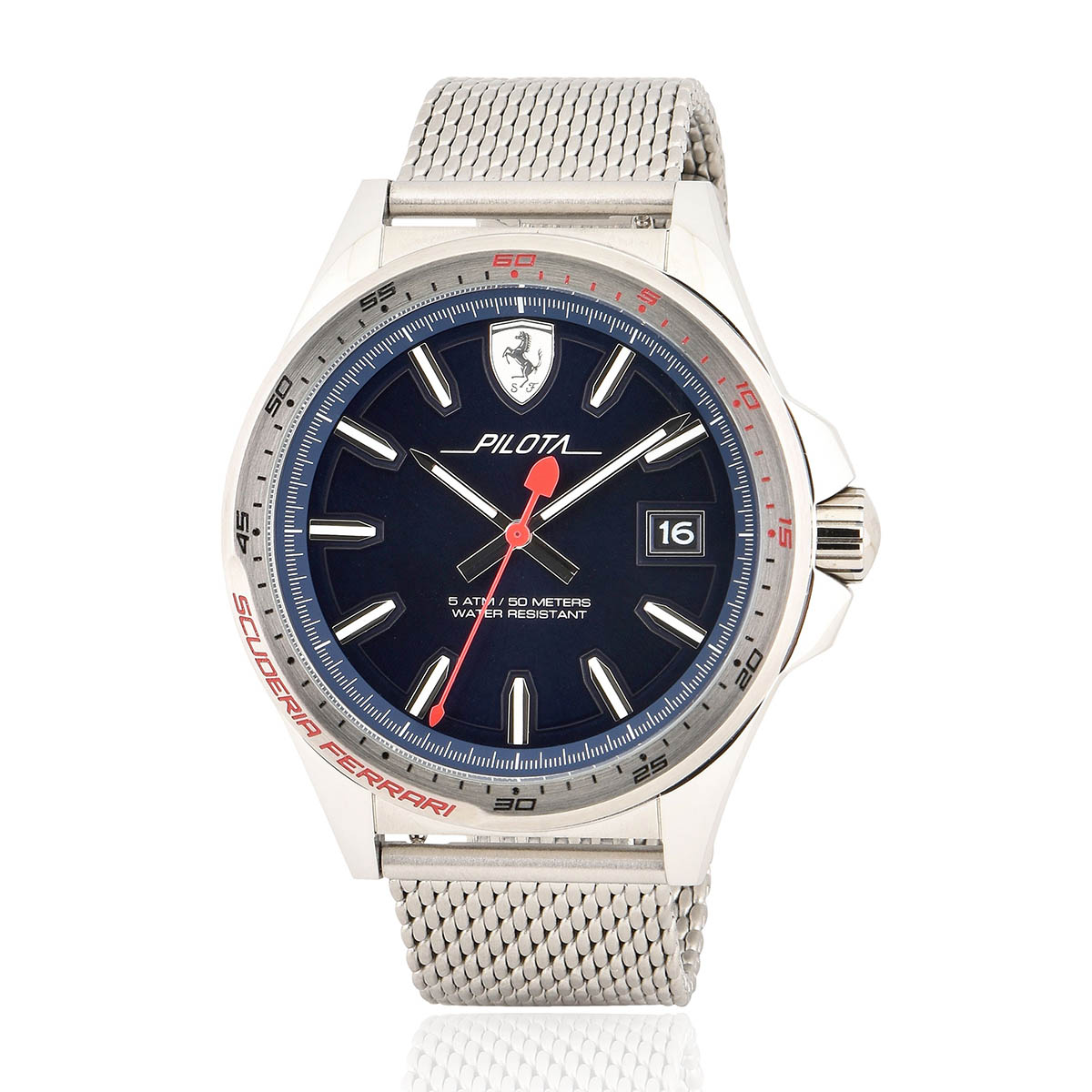 تتميز ساعة Scuderia Ferrari Pilota من فيراري، بواجهة زرقاء داكنة وحزام من الفولاذ، وتمزج بين ذوق محبي السيارات الرياضية العصرية والسيارات الكلاسيكية الانيقة.