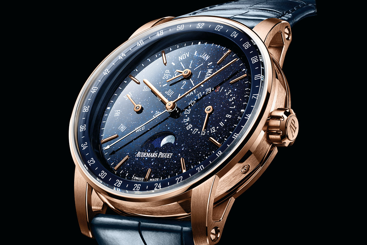 ساعة فلكية بامتياز، حيث يتميّز التقويم الدائم لـ CODE 11.59 من مجموعة أوديمار بيغه بمينا من الأفينتورين الأزرق الداكن ومينا ثانوية تُذكرنا بسماء مرصّعة بالنجوم. تم ابتكار زجاج الأفينتورين في القرن السابع عشر نتيجة معالجة حصلت بالمصادفة ("all'avventura") في مصنع زجاج مورانو عندما سقطت برادة النحاس في زجاج مصهور في مرحلة التبريد، مما أعطى كوكبة من الجسيمات المتلألئة. واليوم، يتم إنتاج هذا الزجاج من خلال إدخال أكسيد النحاس الأسود والكوبالت التي تعطي اللون الأزرق للزجاج. ويساهم إطار الساعة، عقاربها، وعلاماتها المصنوعة من الذهب الوردي في إثراء الكوكبة المتلألئة باللون الأزرق الداكن في مينا الأفينتورين.