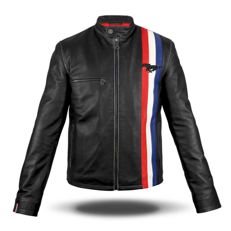 واذا اخترت تلك التي دخل اليها اللون الاحمر، يمكنك شراء سترة Ford Mustang Leather Jacket المصنوعة من الجلد الاصلي والمتوفرة باللون الاسود والتي تحمل ثلاثة الوان: الاحمر والبيض والازرق شعارا لها.