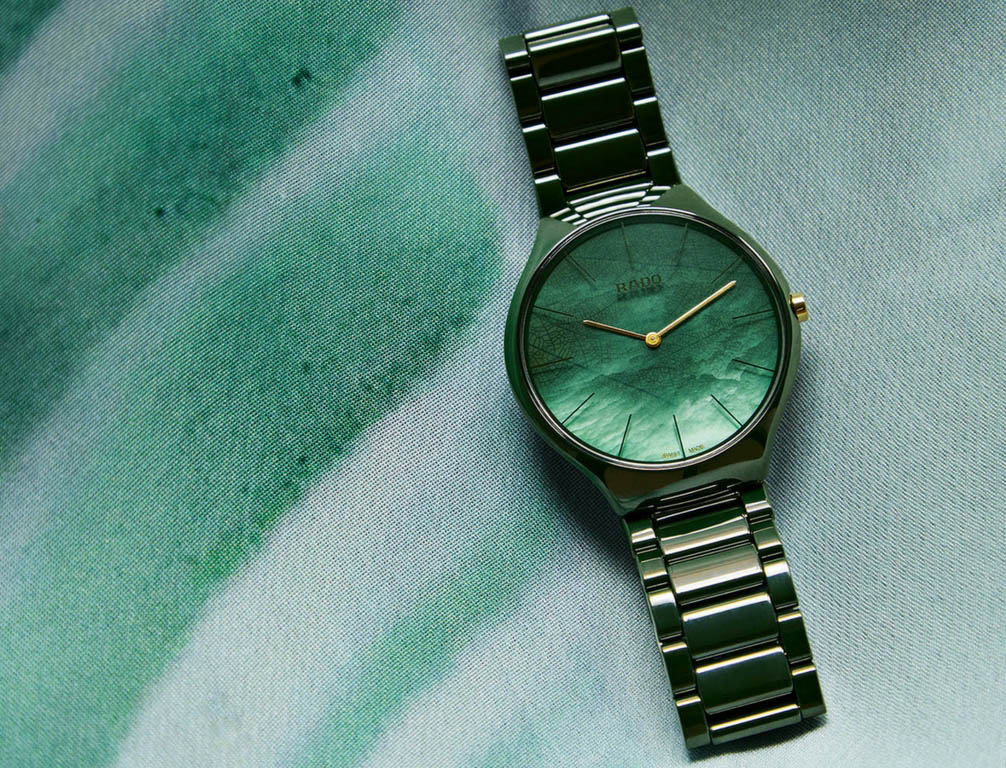 اختارت RADO لوناً غير تقليدياً، فغطّى اللون الأخضر المائل إلى الزيتي كل الساعة سواءاً المعصم أو الشاشة وخلفيتها، وجاءت بتصميم بسيط وراقي جداً مع عقارب باللون الذهبي.