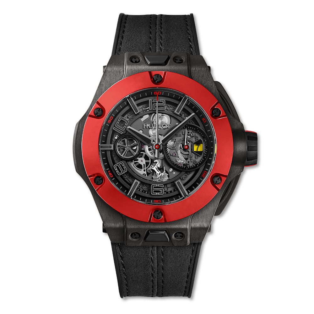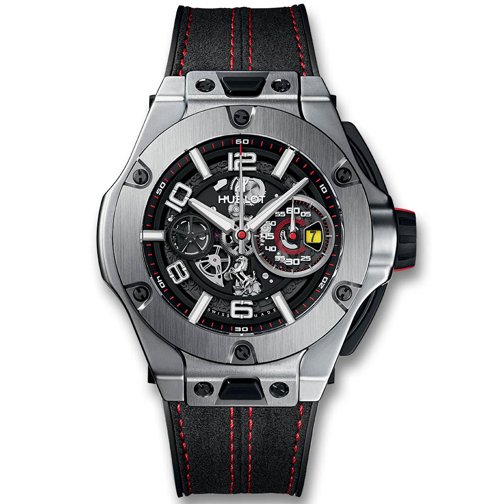 اما عشاق الاطلالة الاكثر جرأة وعدائية، فسيختارون هذه الساعة المصنوعة من التيتانيوم لاظهار الجانب الرجولي في ساعات هوبلو. ودخل كل من الكريستال وحجارة السفير الى قالب هذه الساعة لزيادة فخامتها. وقد صنع منها 500 نسخة فقط، في اصدار محدود يدعو عشاق فيراري الى التميز به.