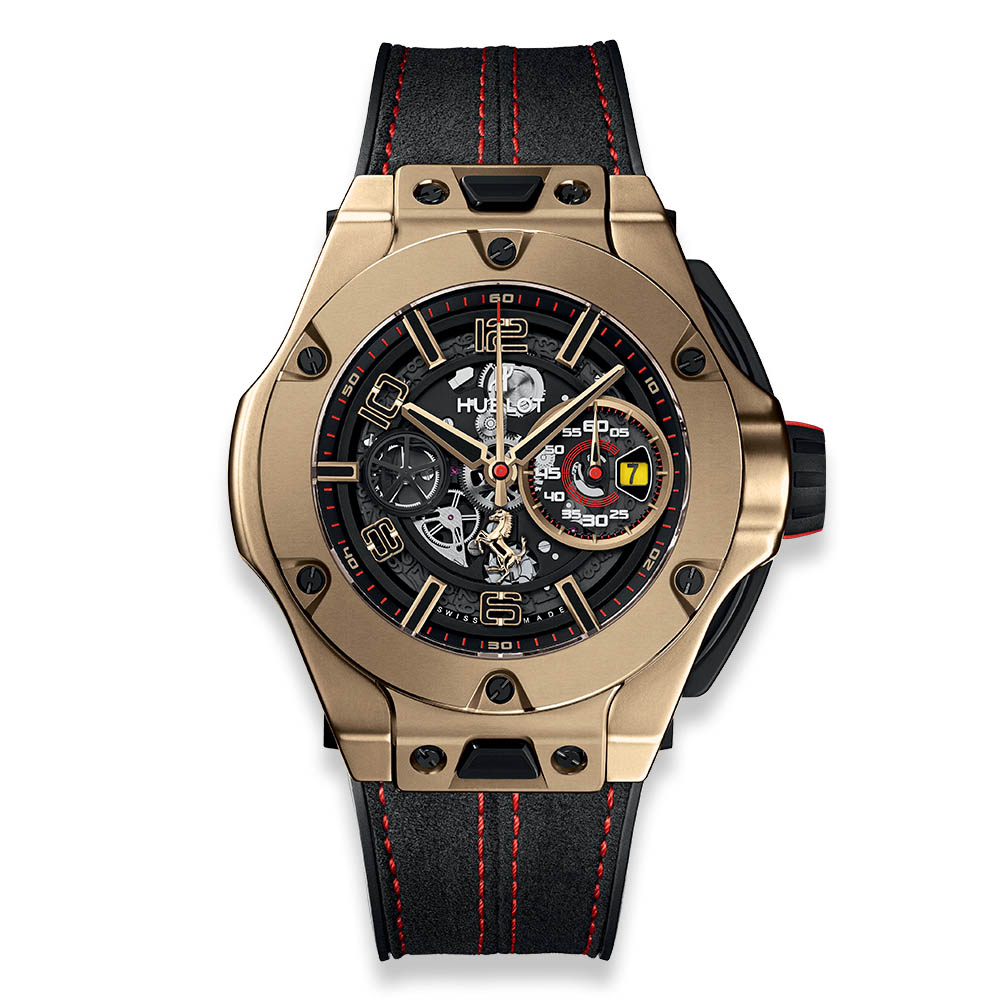 اما من يتطلع الى الفخامة اكثر من الاطلالة الرياضية، فسيختار هذا الاصدار من هوبلو. فهذه الساعة صنعت من 18 قيراط من الذهب لتضمن لمرتديها الفخامة التامة. هذا وادخل عليها السفير والكريستال لجودة اكبر. ولم تنسى الشركة ادخال اللون الاحمر في تفاصيل الساعة عبر مزجه مع سواد الكستك لتشبه هي ايضا سيارات فيراري.