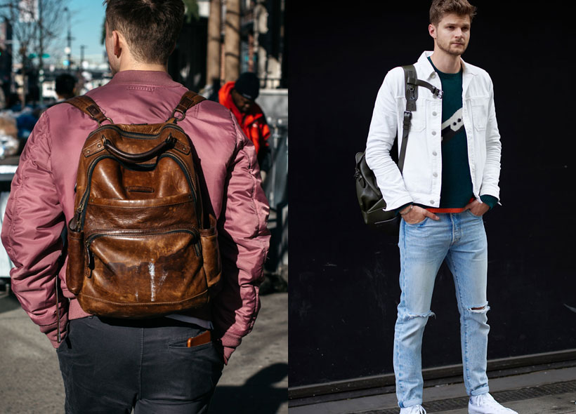 هناك نوعان من الحقائب، أنيقة وفاخرة أو قديمة وساحرة. فحقيبة الظهر الجلدية هي لمسة راقية لإطلالة رائعة، ارتدي جينز ضيق، وسترة جرافيكية بيضاء مع حذاء رياضي ابيض.