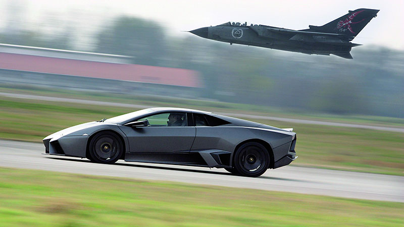 اعترف مصمم لامبورجيني السابق، فيليبو بيريني، أن الكثير من تصاميم سيارات العلامة الإيطالية مستوحاة من الطائرات المقاتلة، خاصة طائرات F-22 وB-2 الأمريكية، حيث أن طريقة تصميم هياكل لامبورجيني التي تبدو كالفولاذ المقطع تشبه أسلوب تصميم تلك الطائرات.