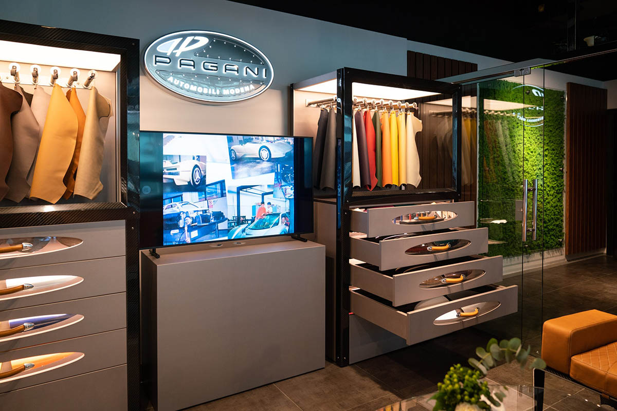 يمكن لعملاء باجاني اختبار مجموعة واسعة من المواد الحصرية، والألوان، وعناصر الزينة، والأقمشة التي يمكن استخدامها في سيارات باجاني، والتي يجدونها مجتمعة في أجواء إيطالية بامتياز، حيث تتعانق رائحة جلد باجاني مع رائحة قهوة إسبريسو الإيطالية الأصيلة.