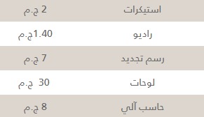 وأخيراً يجدر الذكر بأنه توجد نثريات يتم دفعها عند تجديد رخصة قيادة السيارة، وقيمتها ضئيلة جداً كما هو واضح بالجدول أدناه: