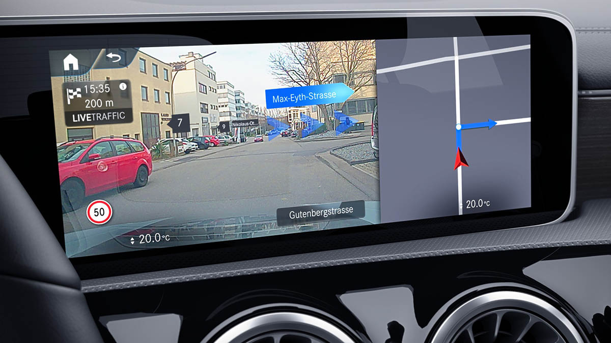 يتوفر نظام الملاحة الجديد عبر نظام MBUX للترفيه المعلوماتي، حيث يقوم باستخدام الشاشة الوسطية أمام السائق لعرض خريطة حية للطريق الذي توشك السيارة أن تسلكه، وباستخدام الواقع المعزز، يتم إظهار أسهم افتراضية على الشاشة بشكل ثلاثي اﻷبعاد كي ترشد السائق إلى اﻹتجاه الذي يجب أن يسلكه بوضوح تام.