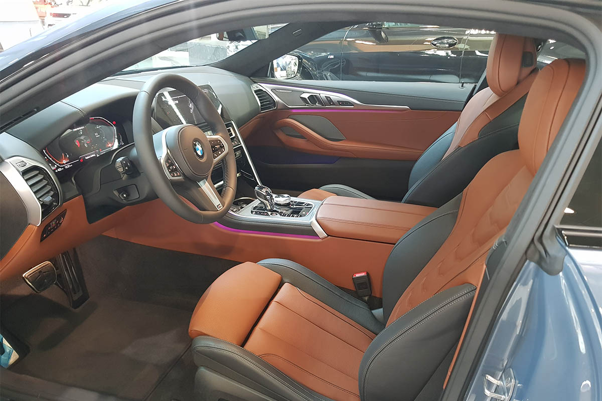 على صعيد المقصورة الداخلية، تتمتع سيارة 850i بمقصورة تتحلى بلمسات سيارات بي ام دبليو الفاخرة مع خيارات متعددة حسب الطلب. السيارة المعروضة M850i فئة Individual تأتي بمواصفات فئة M الرياضية مع مقاعد جلدية خاصة بخاصية التدفئة والتبريد والتحكم للسائق والمرافق، مفتاح ذكي مع شاشة، نظام الاتصال والتحكم الخاص، نظام صوت محيطي، مقود رياضي، سقف من الياف الكربون، شاشة وسطية 10.3 بوصة تدعم اللمس و شاشة معلومات رقمية 12.3 بوصة للسائق والعديد من المواصفات الاخرى.