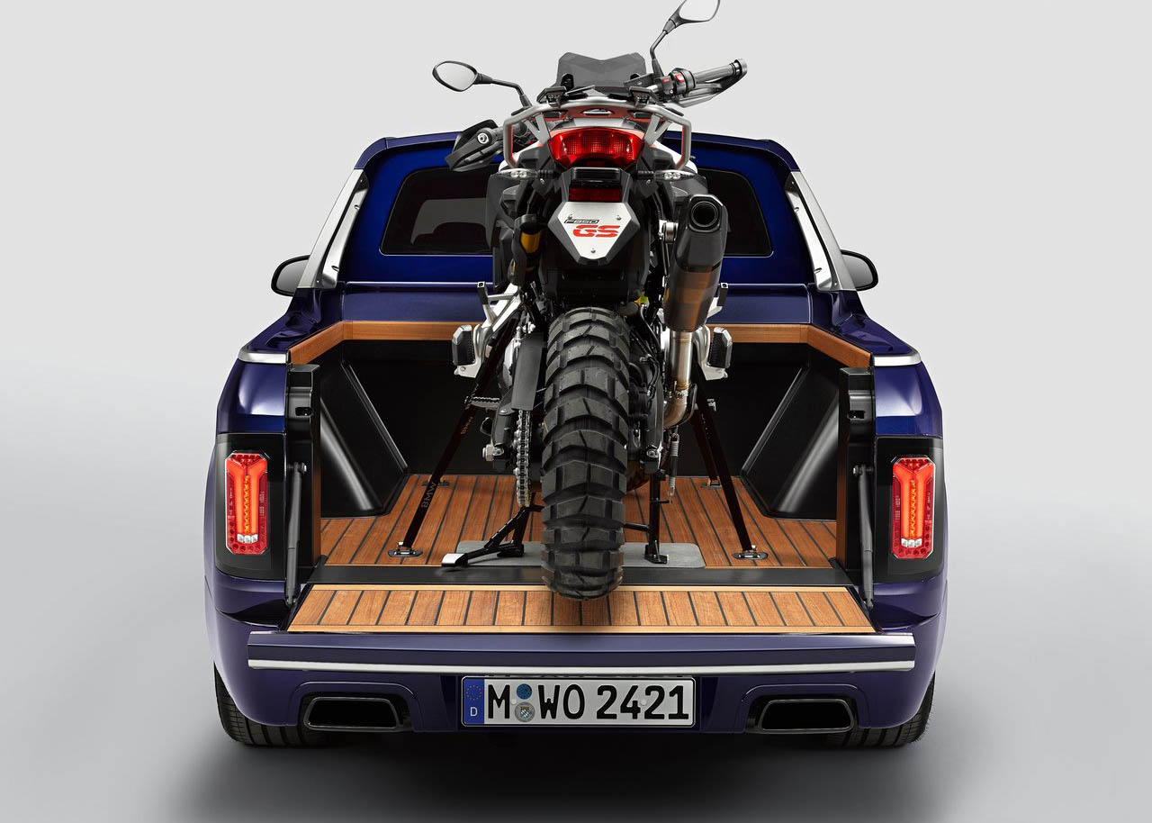 كيف قررت بي ام دبليو تسليط الضوء على المساحة المذكورة؟ عبر وضع دراجة F 850 GS المخصصة للمغامرات والطرقات الوعرة في الصندوق الخلفي (ولكن لا أظن بأن وضع دراجة نارية من هذا النوع على صندوق مصنوع من خشب فاخر هو فكرة سديدة).
