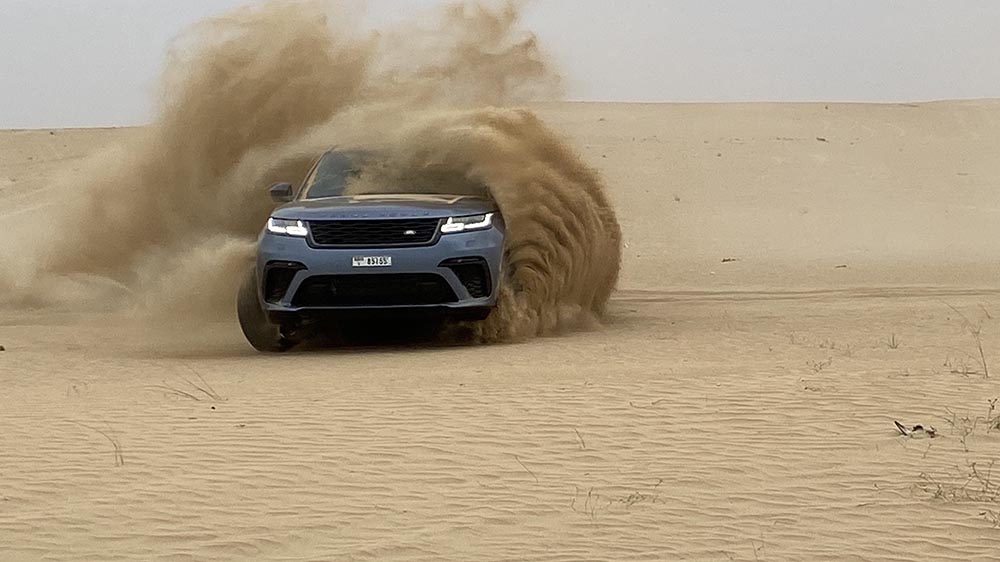 أما رابعاً، وهو ما قمنا به، دخلنا صحراء دبي ووضعنا رنج روفر فيلار SV أتوبيوغرافي ديناميك إيديشن في نمط القيادة الرملي لنتسلى إلى اقصى حدود.