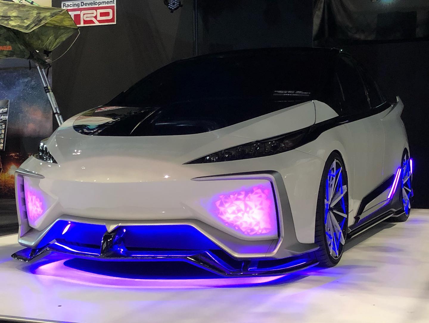 أما بالأمام، فنجد اثنين من الأسطح الواقعة على جانبي المصد الأمامي العدواني للغاية، حيث تقوم هذه الأسطح ببث إضاءة وامضة تجعل السيارة تبدو وكأنها تتنفس، مع وجود جهاز صغير يبث لون أرجواني مضيء داخل العجلات الأربعة.