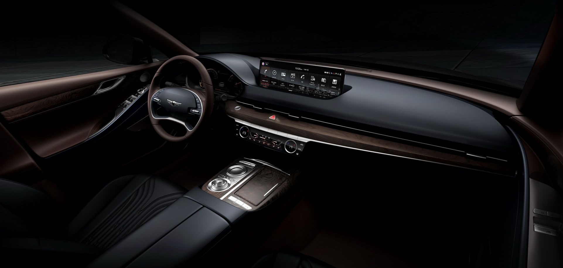 تتمتع جينيسيس G80 بمقصورة فاخرة جداً مع خامات عالية الجودة عبر كسوة جلدية فاخرة وتقليمات وزخارف خشبية بتصميم عصري، وهي تقدم لنا مقعد سائق يضم 7 خلايا هوائية قابلة للتعديل لزيادة مستوى الراحة بالجلوس حسب وضعية القيادة، إضافة لنظام ضبط وضعية الجلوس تلقائياً لتقليل مستوى تعب السائق بالرحلات الطويلة، مع مساحة رحبة لكافة الركاب.