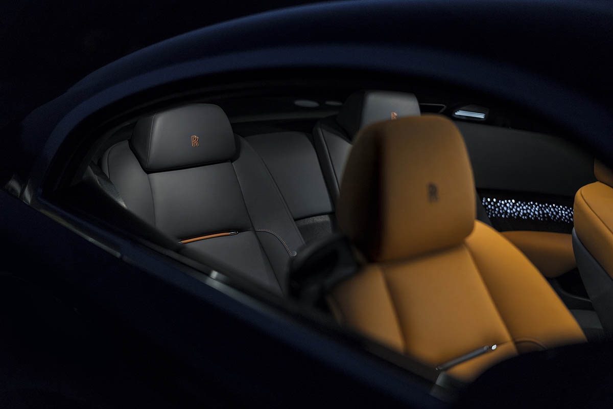 تتألّق المقصورة بفخامة تتسّم بطابع عصري سرعان ما تنكشف أمامكم عندما تفتح الأبواب بشكل عكسي، فينساب الضوء من الأمام إلى حجرة الركاب الخلفية. أمّا الميزة الرئيسية في هذه المجموعة فهي خشب السنديان Tudor Oak، المستخرج من غابات جمهورية التشيك والذي تمّ اختياره من أجل لونه وكثافته وتركيبته. تم استعمال 176 ضوء LED تسمح للضوء بالتغلغل عبر تصميم مثقب بشكل دقيق جداً في الكسوة الخشبية مما يحقق نمطاً آسراً يذكّرنا بالضوء الذي يتركه خلفه الشهب.