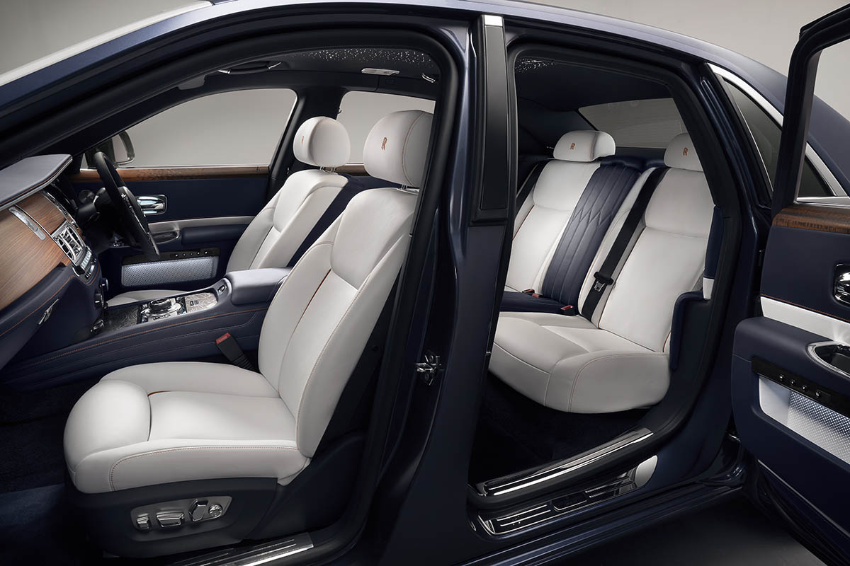 وكان لأعضاء وحدة بيسبوك للتصميم حسب الطلب في مشغل الجلد في دار رولز-رويس دورٌ كبيرٌ أيضاً في السيارة من خلال فنّهم المتقن حيث تمّ تزيين المقاعد الخلفية بتطريز مستوحًى من تفاصيل مقعد سيلفر جوست التي طُرحت عام 1907. وينتقل التطريز بكثير من الأناقة من الجزء الخلفي إلى القسم الأمامي من المقصورة، وفي زينيث ذات قاعدة العجلات الممدّدة، تتجه بطانة السقف ببراعة باتّجاه مجسم روح السعادة. وتتألّق المقاعد بالجلد ذا اللون المتناقض مما يعزّز مكانة جوست كالسيارة الفاخرة الأولى ذات الأربع أبواب.