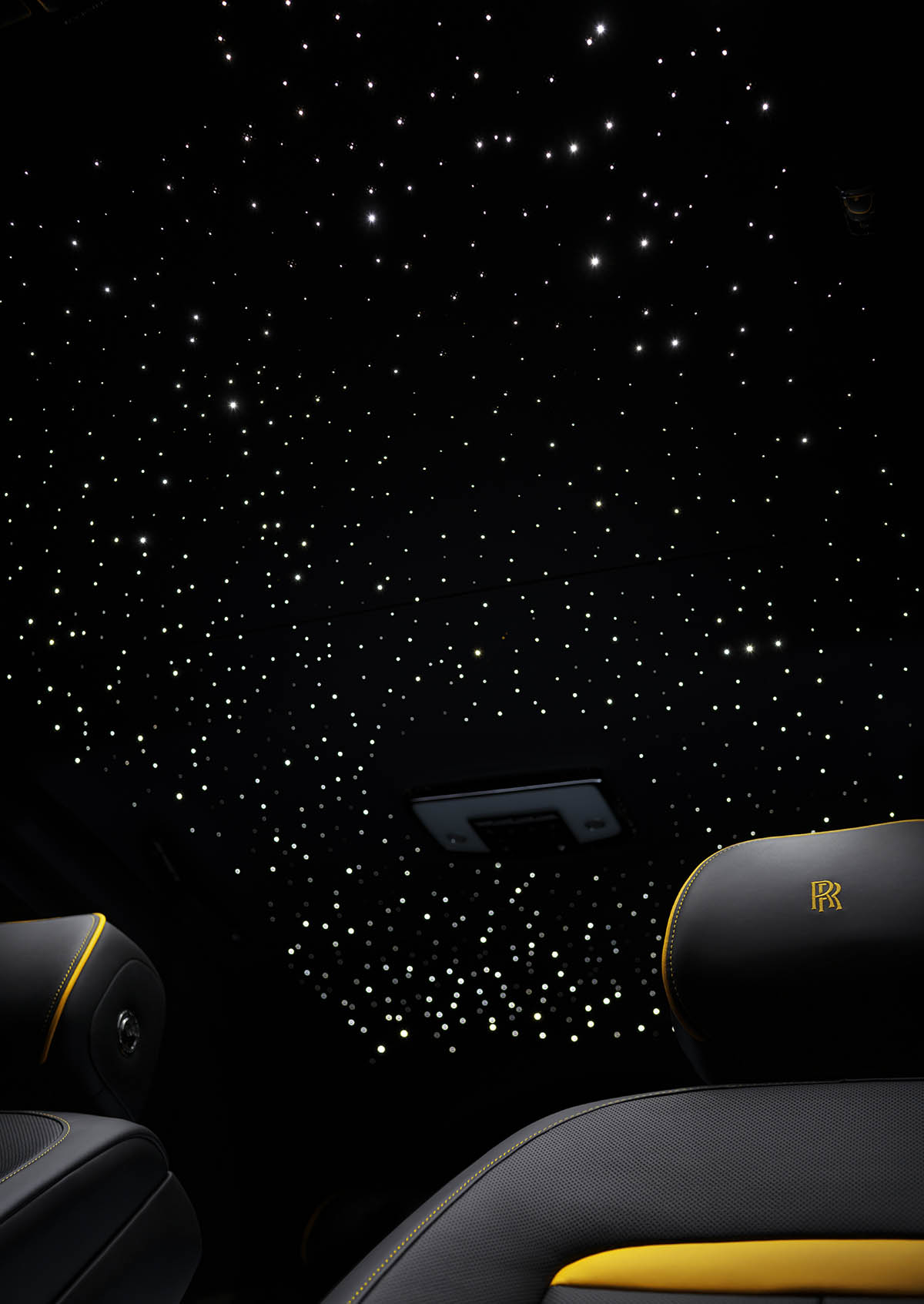 وانضمّت بطانة السقف إلى الرموز الأساسية في رولز-رويس مثل مجسّم روح السعادة، وشبك بانثيون الأمامي، وشعار العلامة المؤلّف من حرفي R. ويعزّز وجودها في كولينان بلاك بادج أجواء المقصورة من خلال إلقاء ضوء خفيف على المقاعد الجلدية الفاخرة. تتميّز بطانة السقف بالجلد الأسود الفاخر، وقد تمّ حبكها يدوياً بما مجموعه 1344 مصباحاً من الألياف الضوئية، وهو انعكاسٌ للسماء في الليل وتدمج ثماني نجوم مذنّبة باللون الأبيض البرّاق تنطلق بشكل عشوائي فوق الراكبين الأماميين.