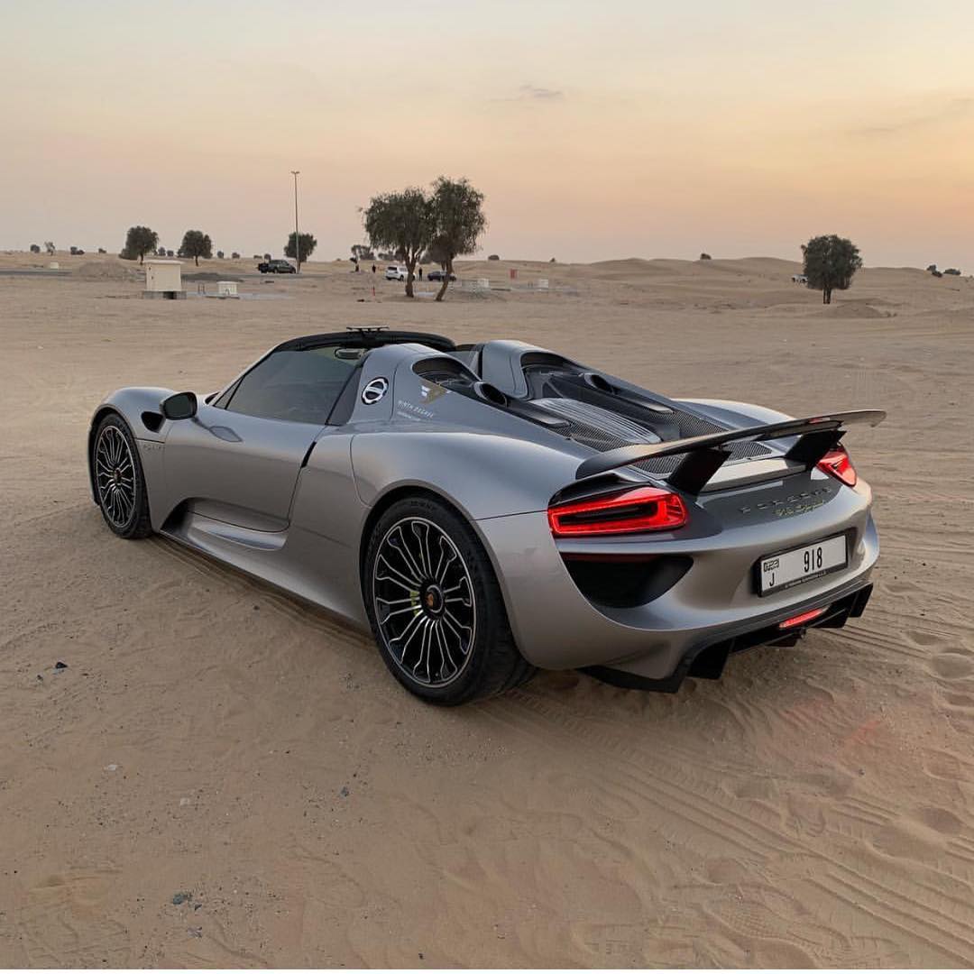 بورشه 918 سبايدر بمظهر رياضي مستوحى من المستقبل، اقل ما يقال عنها انها سيارة خارقة من حيث المظهر والاداء تتوسط صحراء الامارات فتضيف اليها لمسة مستقبلية تحاكي الخيال. ويظهر بالصورة التباين بين اللون الرمادي التي تتشح به البورشه ولون الصحراء الذهبي.