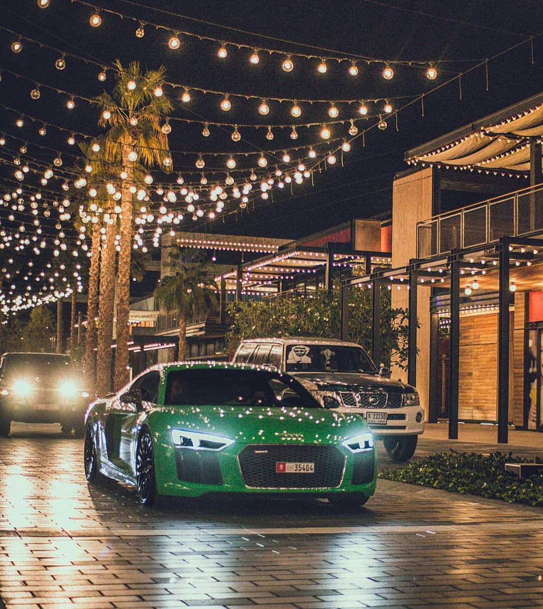ومن الامارات تطل اودي R8 بلونها الفريد لتضيف خضارا الى عالم الامارات الصحراوي. خضار السيارة الانيق والجريء يجبر كل من يراها الى تشخيص النظر، فجاذبيتها لا مهرب منها.