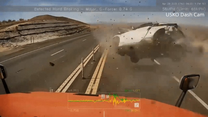 فجأة، اهتزت الشاحنة بشكل غريب على الأرجح عندما رأى السائق سيارة نيسان في مرآته تحاول الضغط عليها، ثم تنزلق نيسان 350Z جانبياً في وجه الشاحنة إلى الحافة، حيث ترتفع وتصطدم بلافتة على جانب الطريق وتتلامس مع حافة مرتفعة في نفس الوقت لترسلها الى الجانب الثاني من الطريق في سحابة من الغبار.