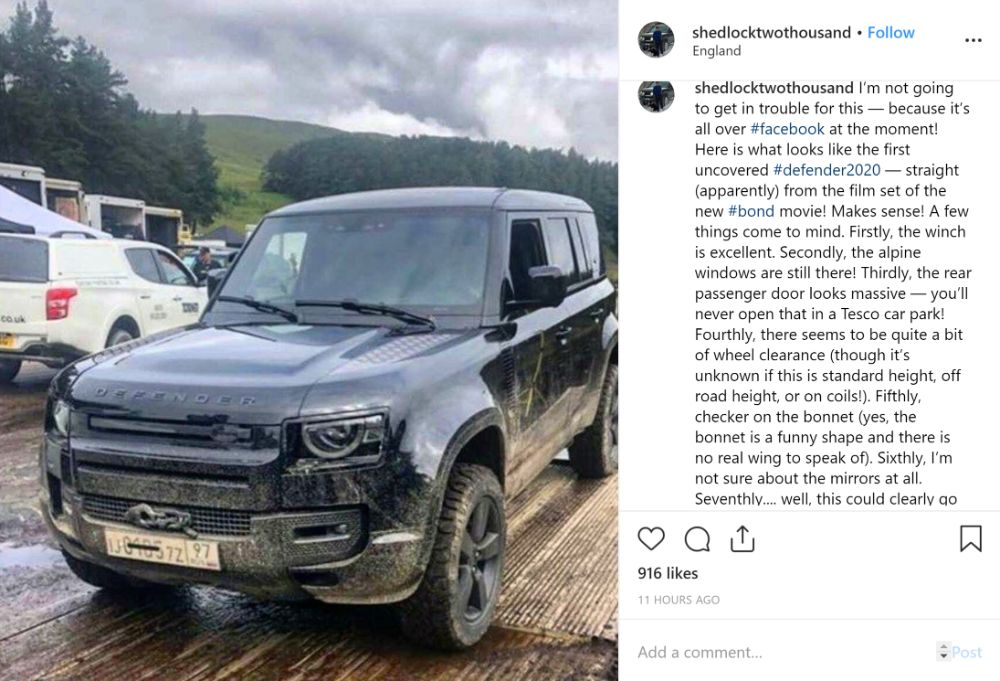 تشير التقارير إلى أن هذه الصورة التقطت في موقع تصوير أحدث أفلام جيمس بوند الذي ستكون ديفندر الجديدة كلياً إحدى نجماته، وهي تبدو مختلفة جذرياً عن الجيل السابق، حيث تتفق أكثر مع لغة تصميم موديلات رنج روفر الأحدث.