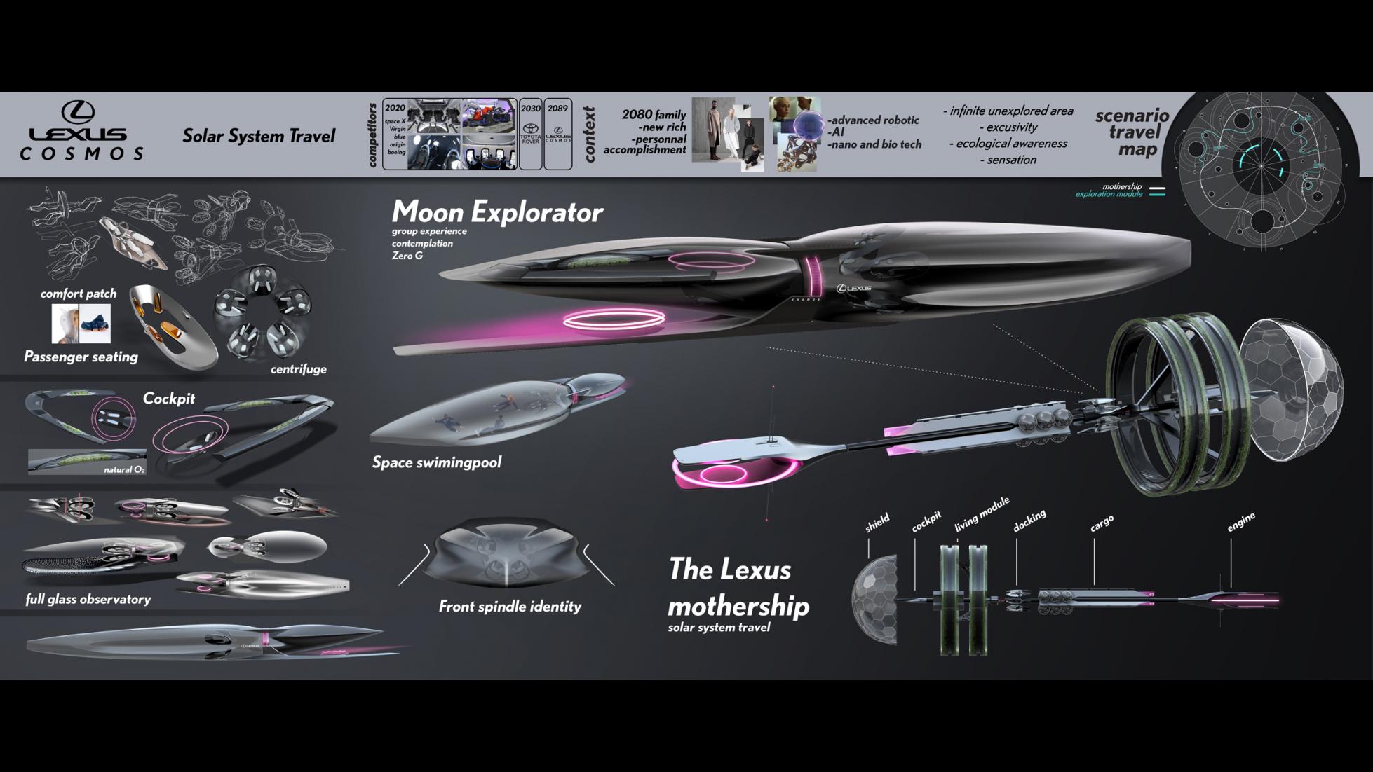 بينما مركبة Lexus Lunar Cruiser تبدو تقليدية نوعاً ما، مع عجلات كبيرة تشبه السيارات نسبياً، والتي يمكن استخدامها للسير على الأرض أو التحليق في الجو، والتي قد تكون الخيار المثالي لنقل البشر من الأرض للقمر.