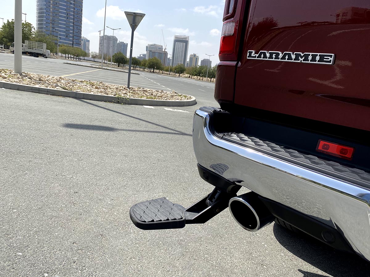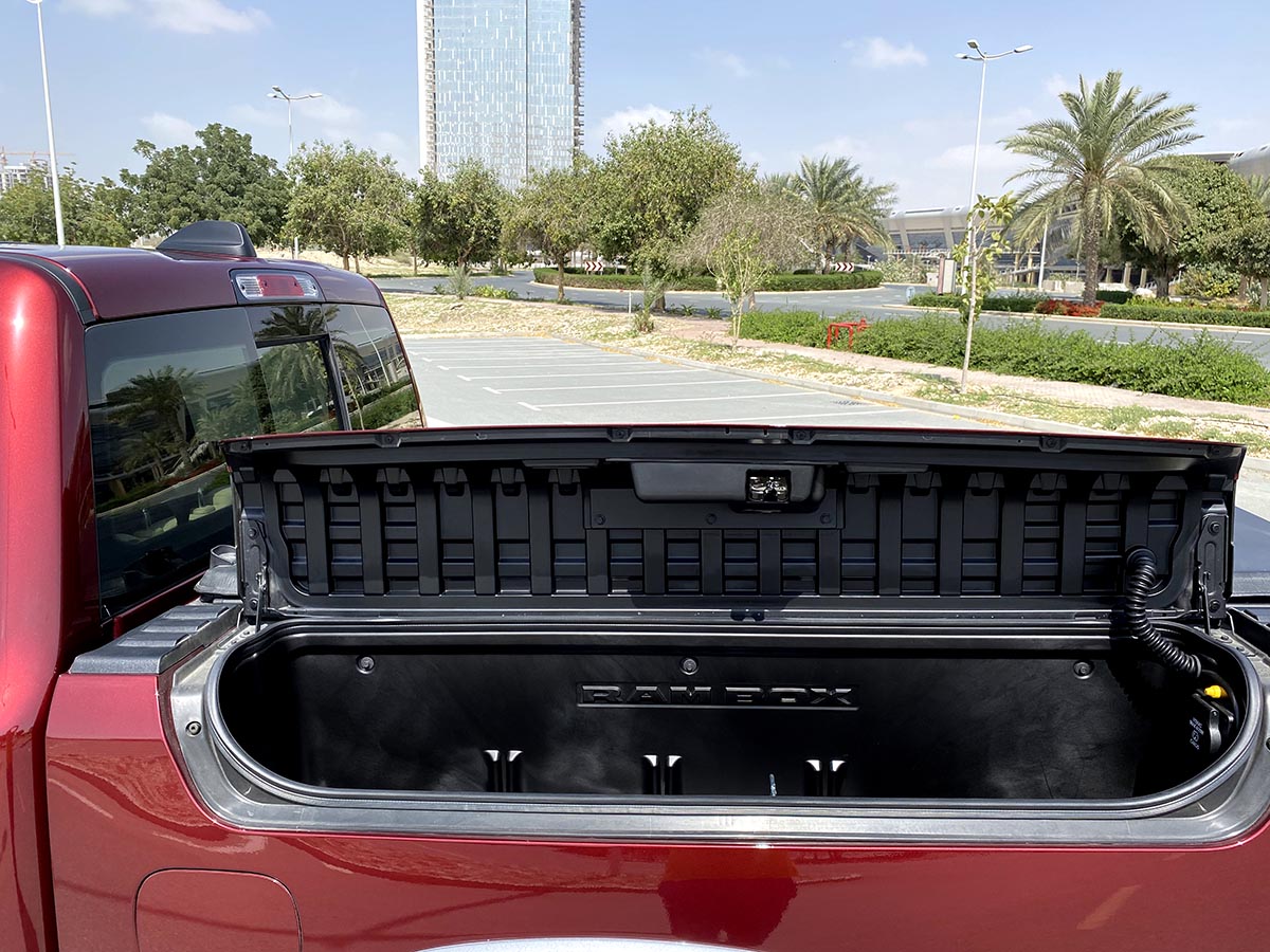 لنبدأ من الخارج، طبعا وكما في أي بيك اب، هناك الصندوق الخلفي الواسع ذات سعة تعتبر الأكبر في تاريخ رام، ولكن ما المميز فيها هو الدواسة الكهربائية التي تساعدك على الوصول بطريقة اسهل الى الحمولة.