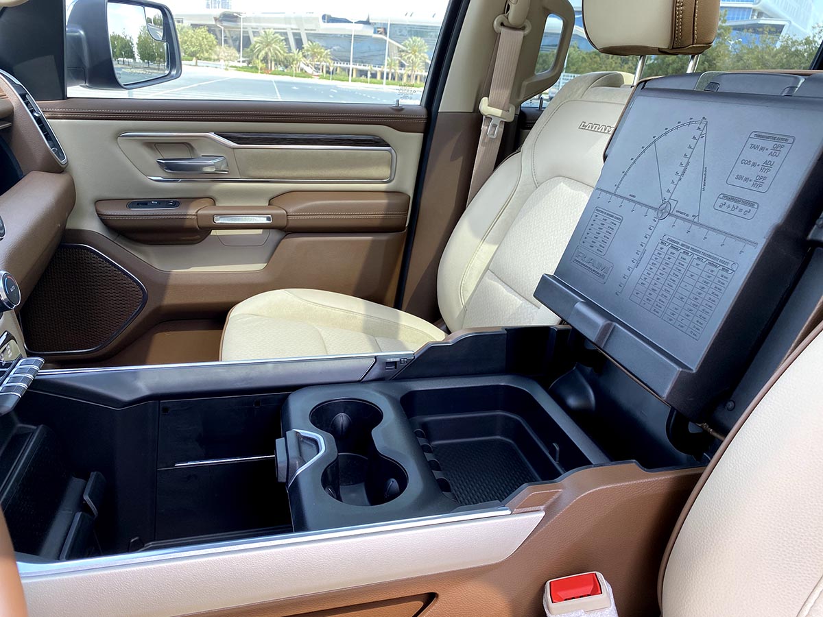 اما من الداخل، فالدهشة تبدأ من الفخامة والرفاهية غير المعهودة في هذا النوع من السيارات، اذ ان المقاعد جلدية والتطريزات اكثر من رائعة والسقف البانورامي يحوّل بيك اب رام 1500 من سيارة أعمال شاقة الى سيارة عائلية بامتياز.