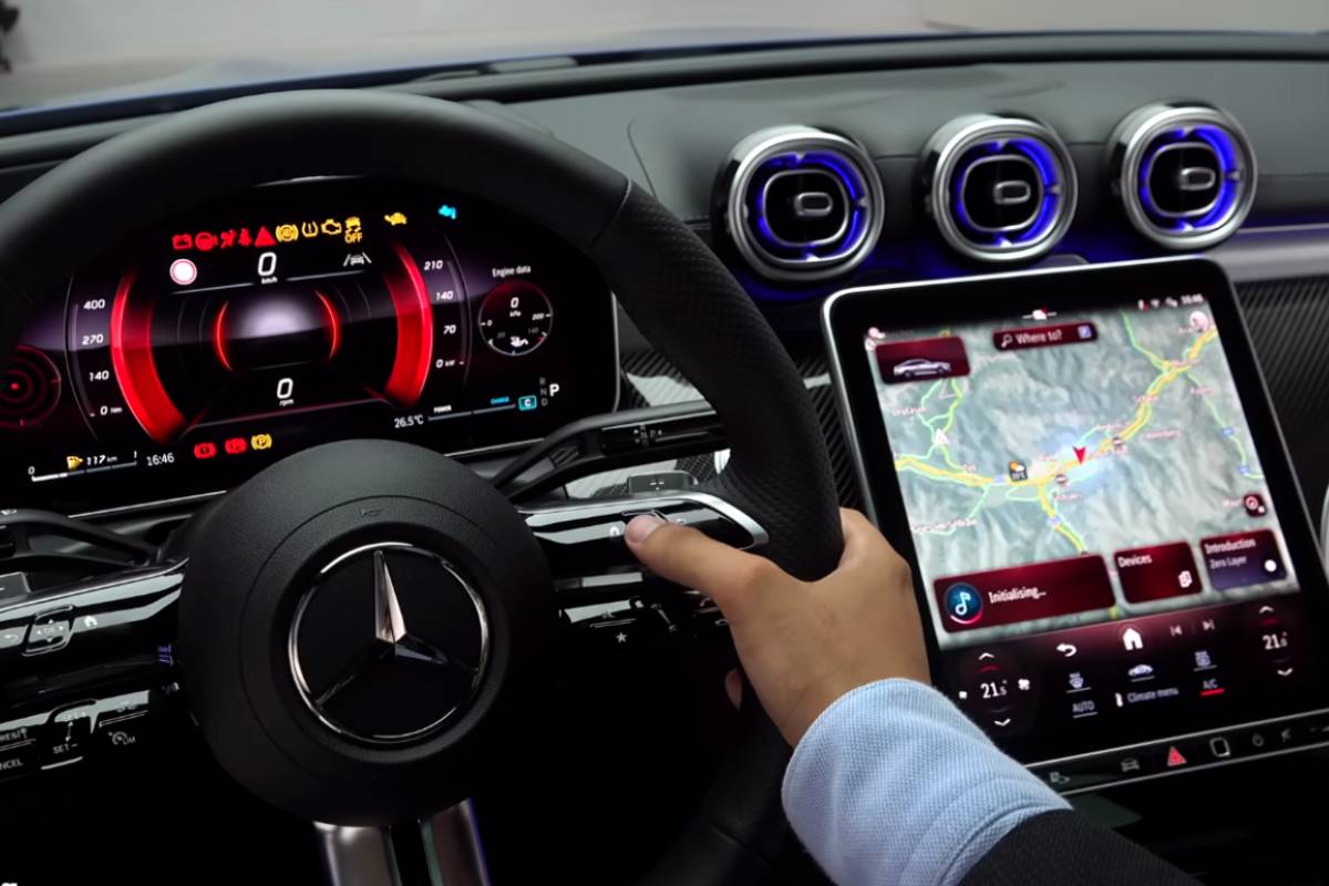 إضافة إلى ما ذكرنا، تحتوي المقصورة على مجموعة عدادات رقمية مقاس 12.3 بوصة وشاشة لمس مركزية مقاس 11.9 إنش مائلة قليلاً نحو السائق، إلى جانب فتحات تهوية دائرية مماثلة، في حين تفتقد السيارة إلى شاشة ثالثة للراكب الأمامي.