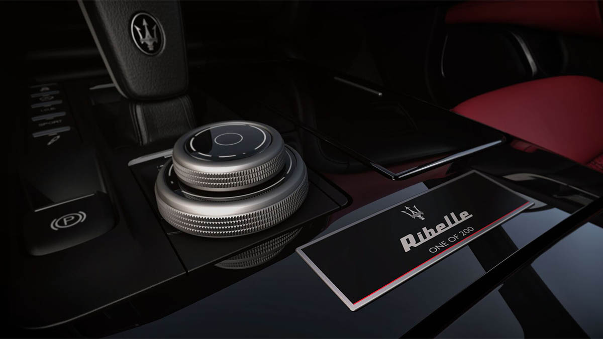 وجرى تأكيد الطابع الفريد للتصميم الداخلي للسيارة غيبلي ذات الإصدار المحدود الجديدة بوضع لوحة صغيرة من الألمنيوم المطلي بالكروم تحمل شعار الرمح الثلاثي الأسطوري الشهير، بجانب شعار "ريبيلي" Ribelle الجديد على الكونسول الوسطي المصنوع من خشب البيانو الأسود. وتحمل اللوحة كذلك رقم السيارة في سلسلة الإصدار المؤلفة من 200 نسخة، وهي مرئية بوضوح لجميع الركاب في المقصورة لإثبات الطابع الفريد والمكانة الحصرية للسيارة.