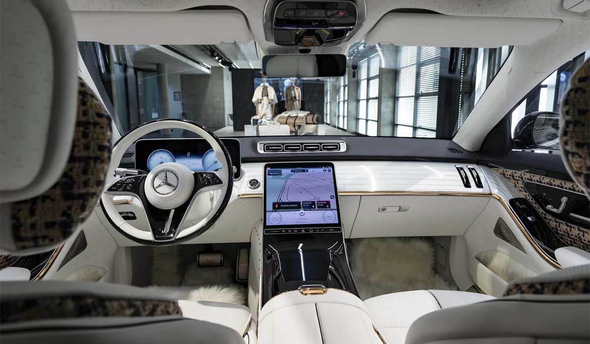 اما داخلية المقصورة الجميلة ياتي الجلد الأبيض العاجي ليزين كل سطح من أسطح السيارة، مع ازدهار متباين من الذهب يثبت في الكونسول الوسطي. ينتشر هذا الشكل الذهبي في جميع الأنحاء مع مادة بوكليه منقوشة باللونين الذهبي والأزرق على طول جدران المقصورة. يعد Bouclé واحدًا من أرقى الأشياء في الحياة التي تظهر نفسها في مايباخ.