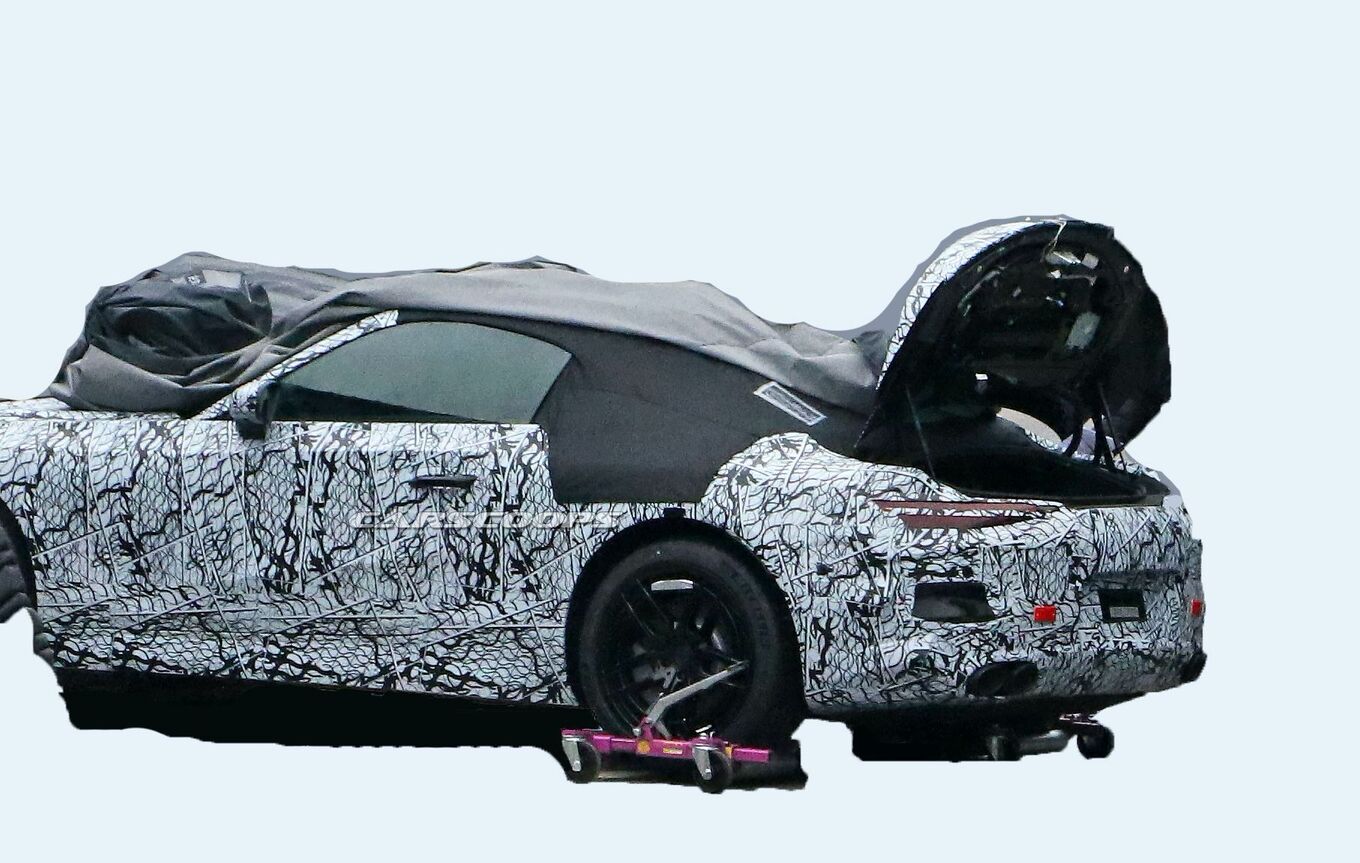 وعلى الرغم من التمويه، من السهل تمييز تصميم المصابيح الأمامية والخلفية الجديد والذي يحمل بصمة مرسيدس بوضوح، أما أبرز تغيير يشهده الجيل الجديد للـ SL، فهو السقف الكابريوليه القماشي فيما كان في الأجيال السابقة حديدياً فقط.