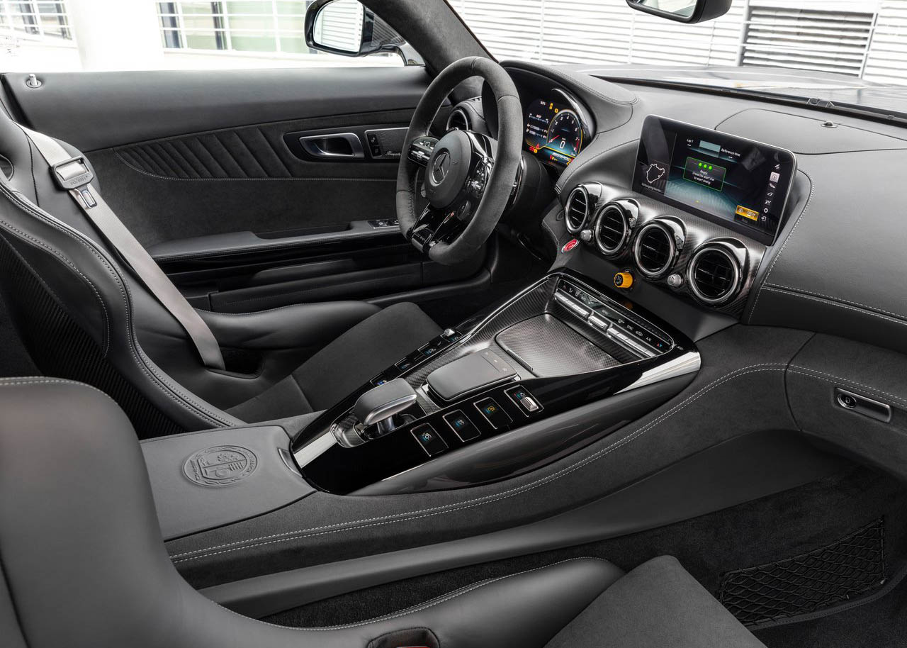 كما تاتي GT R برو بمكابح سيراميكية قياسية وجنوط AMG الخفيفة عالية الأداء بلون "رمادي التيتانيوم" بشكل حصري.. وبالنسبة للتحسينات الإيروديناميكية فهي متعددة كذلك، مثل فتحات هواء جديدة في الرفرف الأمامي، بينما في الخلف أضافت مرسيدس جزئية خاصة كربونية إيروديناميكية على كل قوس للعجلات.