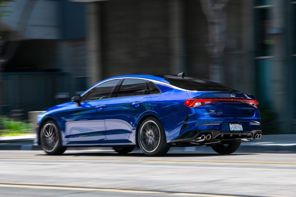 يمكننا القول أن كيا K5 2021 أكثر ديناميكية من أوبتيما بشكل ملحوظ، حيث تكاد تبدو كسيارة مختلفة كلياً وليست جيل جديد فقط، فهي تأتي مع شبك تهوية على شكل "وجه النمر" بدلاً من "أنف النمر"، مع مصابيح أمامية نحيلة ذات إضاءة نهارية نراها ممتدة بين غطاء المحرك العضلي والرفرف الأمامي الحاد المختلف جذرياً عن الشكل الجانبي لـ أوبتيما 2020.