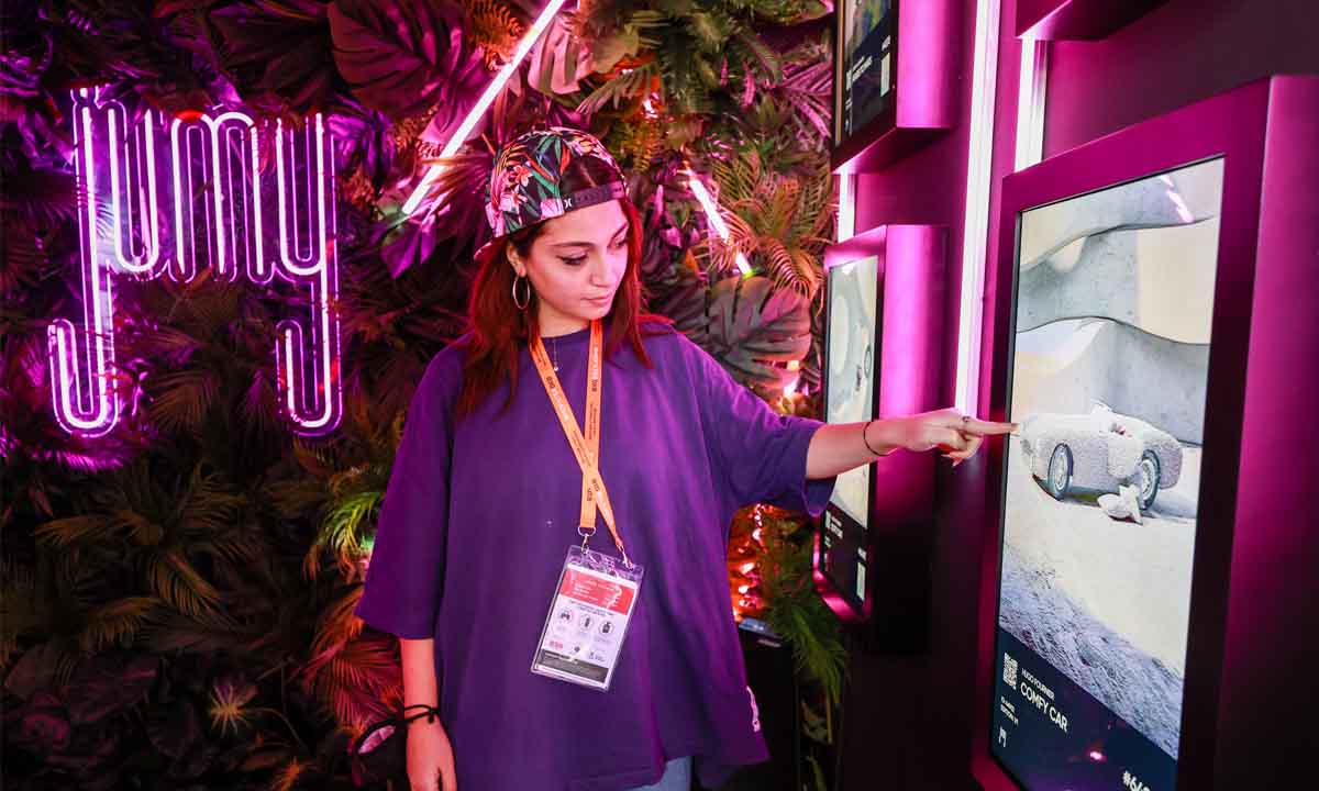 ومن بين العروض الفنية المتعددة التي يستضيفها المعرض، تبرز أعمال جومي، منصة تداول الفنون الرقمية (NFT) التي انطلقت في فبراير، والتي تمزج بين الفن الافتراضي والمادي في منفذها المؤقت في المعرض الذي يحمل اسم ذا كيوب باي جومي.